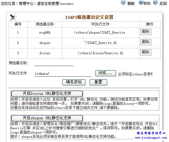 地址重写一般是用于将动态址伪静态。如果本身就是静态就没有必要了。地址重写后网站制作者可以通过输理地址名直接访问。 我司windows平台的虚拟主机于2007年4月5日起,免费支持Urlrewrite功能,用户可以自己在虚拟主机管理中心点击>isapi筛选器 > 开启url静态功能。 discuz论坛和shopex网店系统已经默认支持,如果您要开启,只需要在该页面点“开启”即可立即生效。 其他系统,用户可以自己将相关的dll文件上传至others目录,并点击添加 ISAPI筛选器 即可生效。 理论上可以支持任何系统的urlrewrite, 同时可以扩展支持其他isapi筛选功能。 这个功能在业内是绝无仅有的。 |
